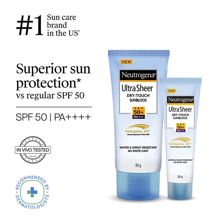 Neutrogena Ultra Sheer Dry-Touch Sunblock SPF50+ can make your skin age prematurely. Step out worry-free with protection against harmful UV rays. Its ultra-light texture makes you feel like you have nothing on. Helioplex™ Technology ensures that sun protection doesn’t break down, effectively blocking damaging UVA and UVB rays. Dry-Touch Technology keeps your skin shine-free and clog-free. Neutrogena® Ultra Sheer® Dry Touch Sunscreen protects the integrity of your skin barrier by shielding it from UV-induced damage, helping your skin stay youthful.